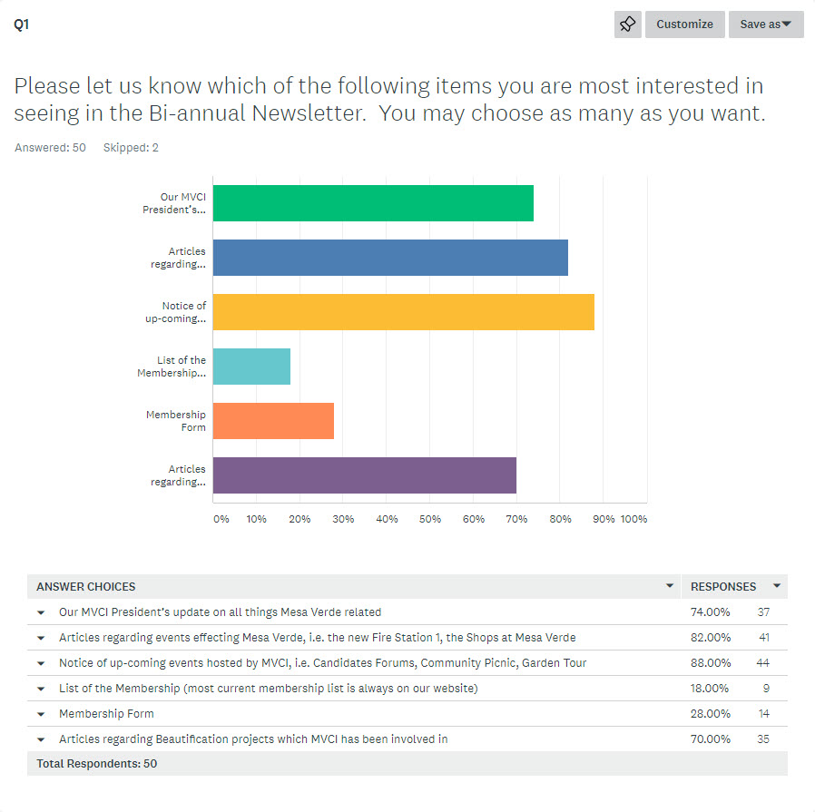 We recently conducted a survey of Mesa Verde, asking what you would like to see in our newsletter. So far we’ve heard from 52 residents; 50 actually responded. Click here to see the results so far. The survey is now closed, but if you intended to reply, please be on the lookout for our next one.