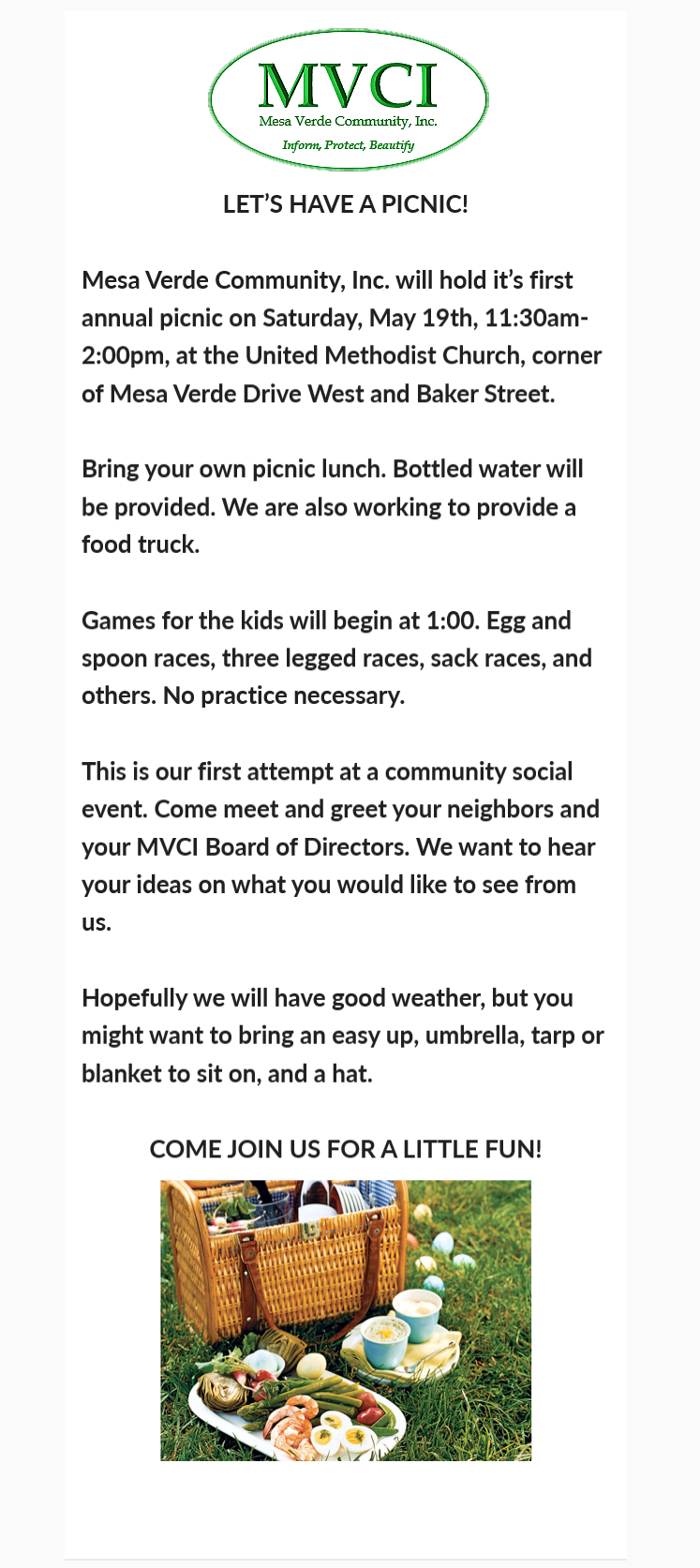 As was mentioned earlier, the pandemic created a huge distraction and one of the things that may have “fallen through the cracks” is membership in MVCI. Membership has always been voluntary, and this includes the MVCI Board of Directors. Membership dues are the lifeblood of the organization and without them, none of the activities would be possible. Dues are only $20 a year…less than a few trips to Starbucks, and we need your help so that MVCI can continue its 50+ year record of service to the community. Please join or renew today! The membership app is on this website and PayPal is available. Also, feel free to share your input with us at admin@mesaverdecommunity.org.